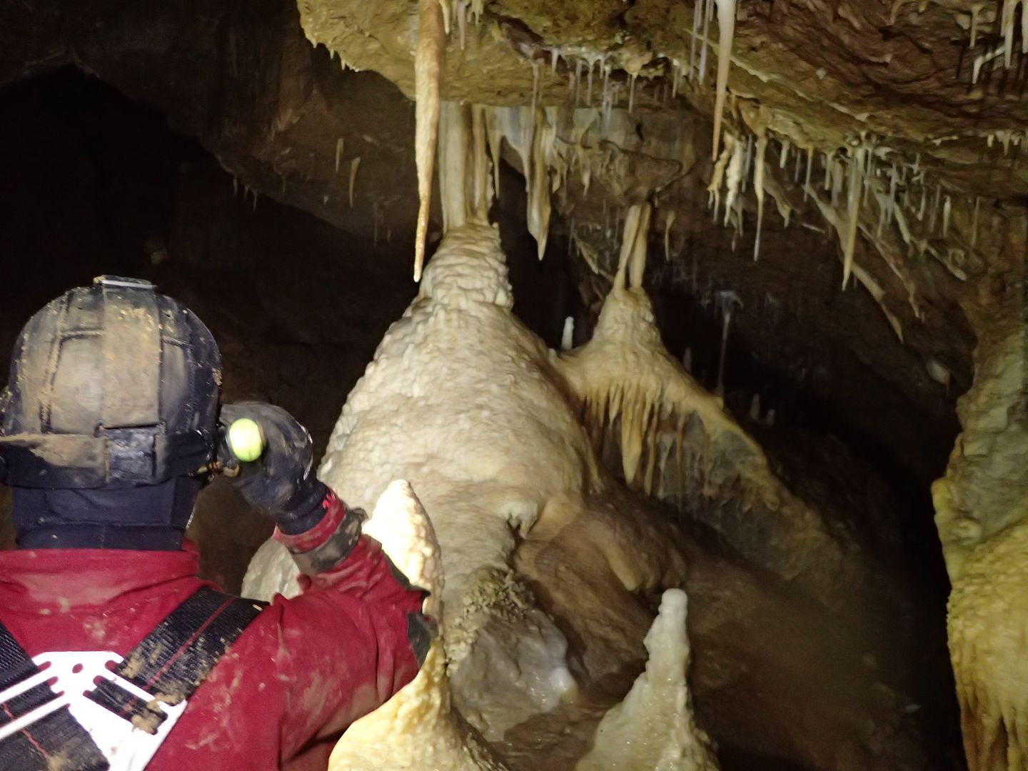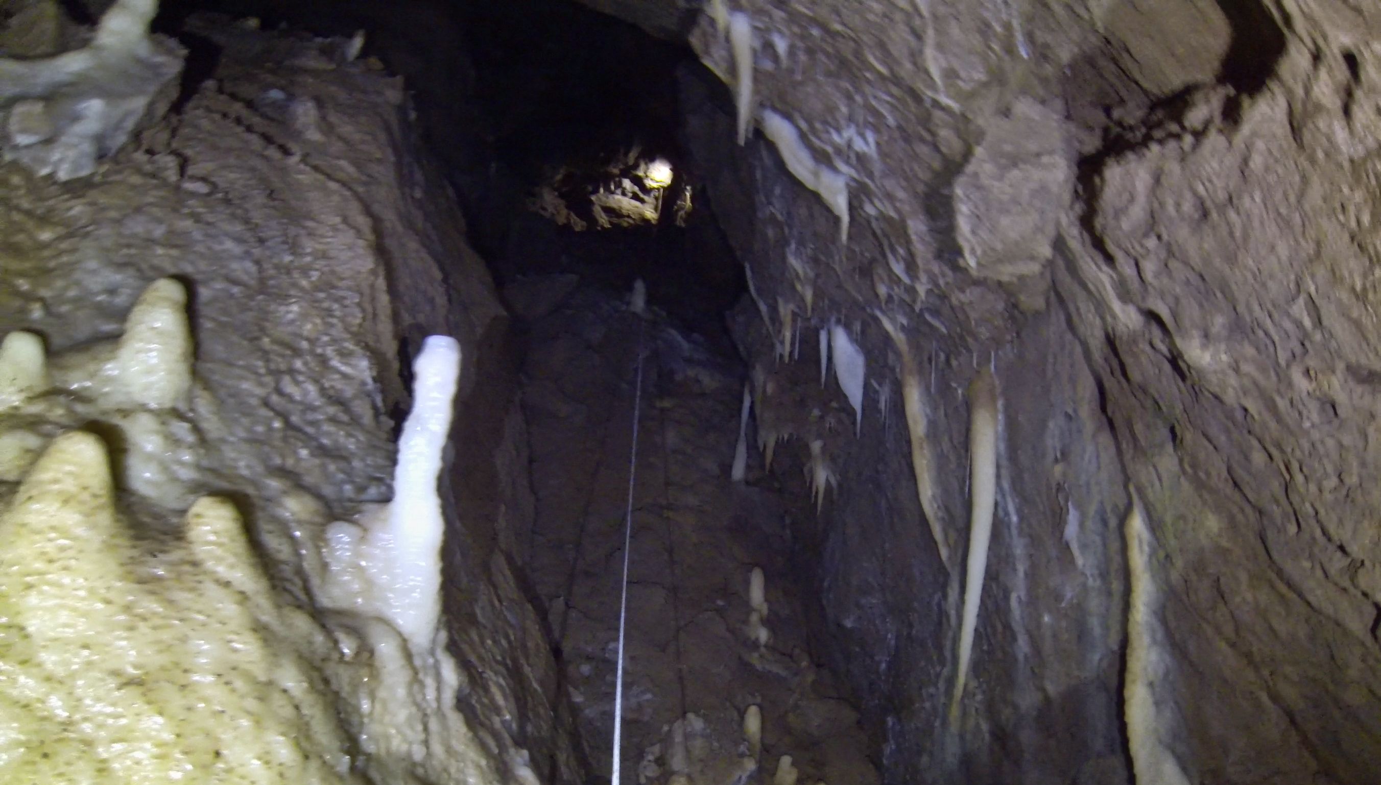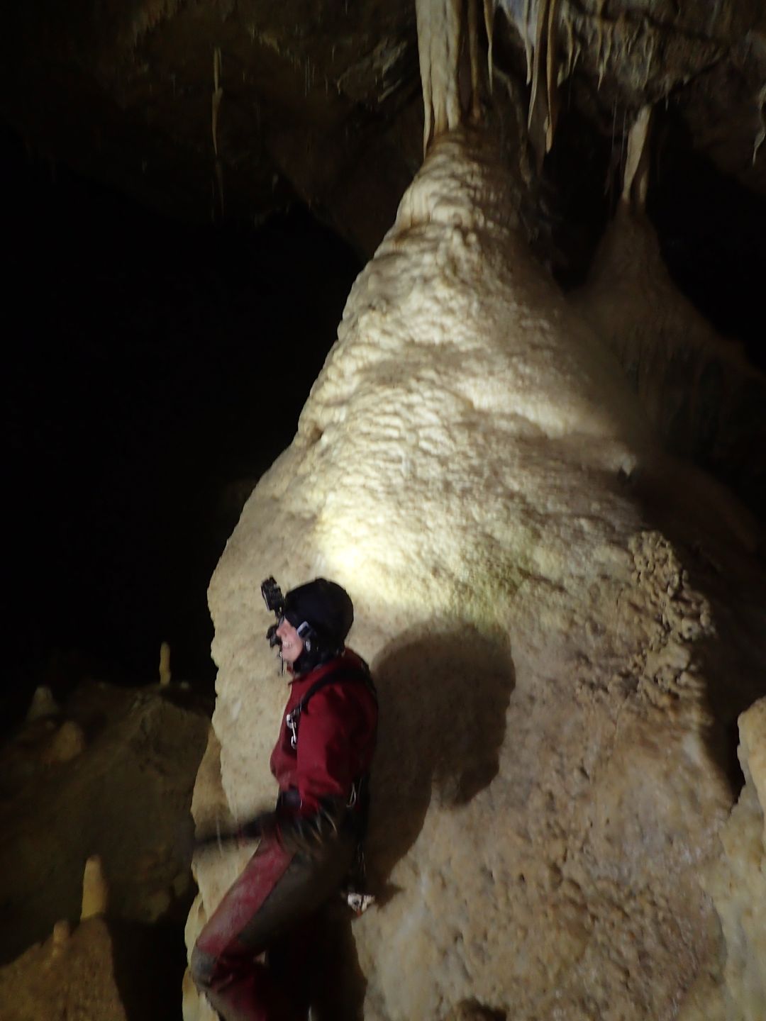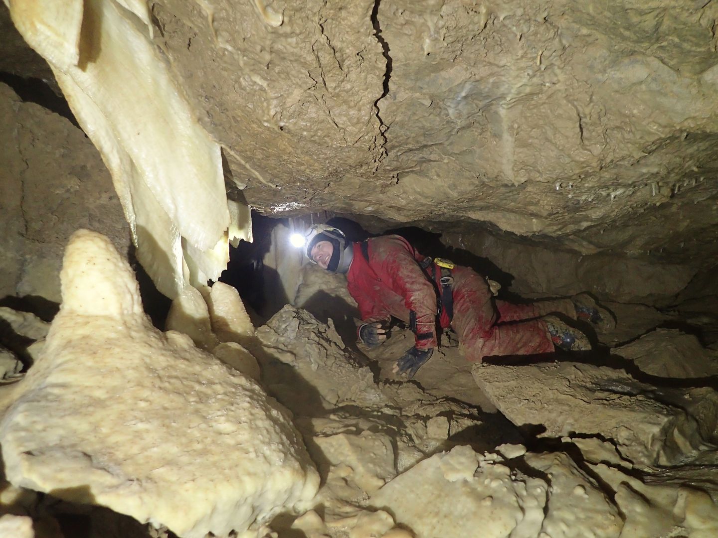 Begünstigt durch die angenehmere Wassertemperatur von zur Zeit 9°C konnten jetzt große Teile der Höhle vermessen werden. Der Höhlenbach folgt bis ca. 85m einem niedrigen Gang, unterbrochen von 6 Siphonen und zwei größeren Kammern bei 12m und 25m. Ab 85m führen Abzweige aus dem Wasser in Trockenbereiche. Schon im niedrigen Bachgang sind einige schöne Sinterformationen, teils als Excentriques, zu finden. In den Trockenbereichen ist die Sinterbildung deutlich stärker ausgeprägt.
