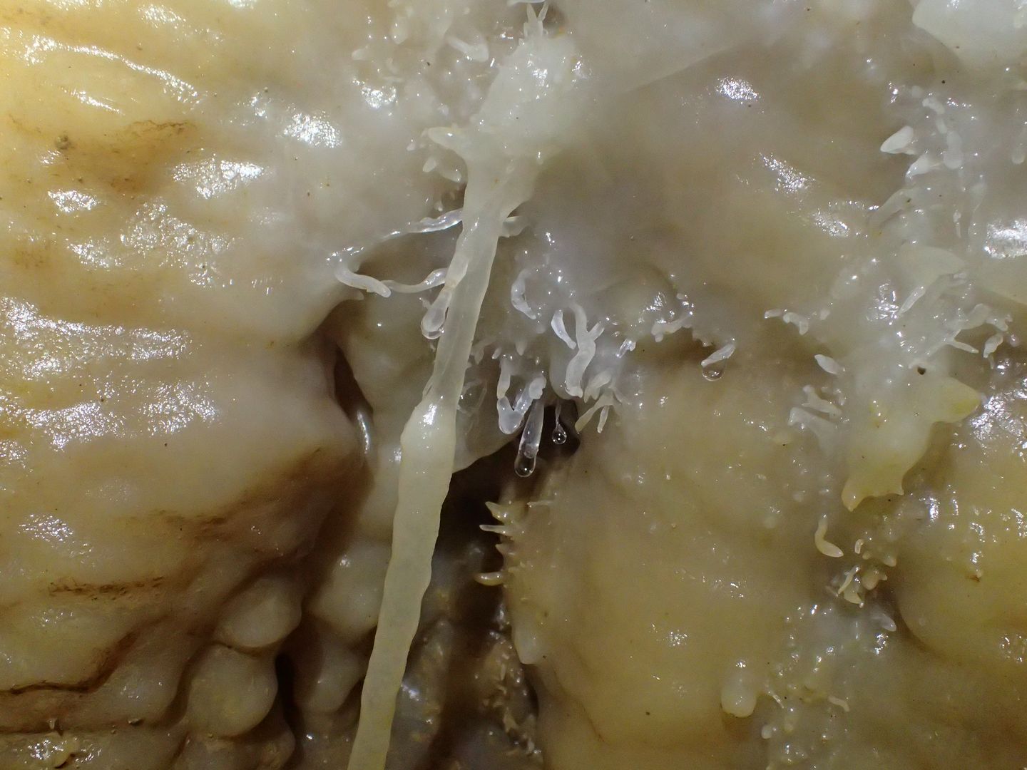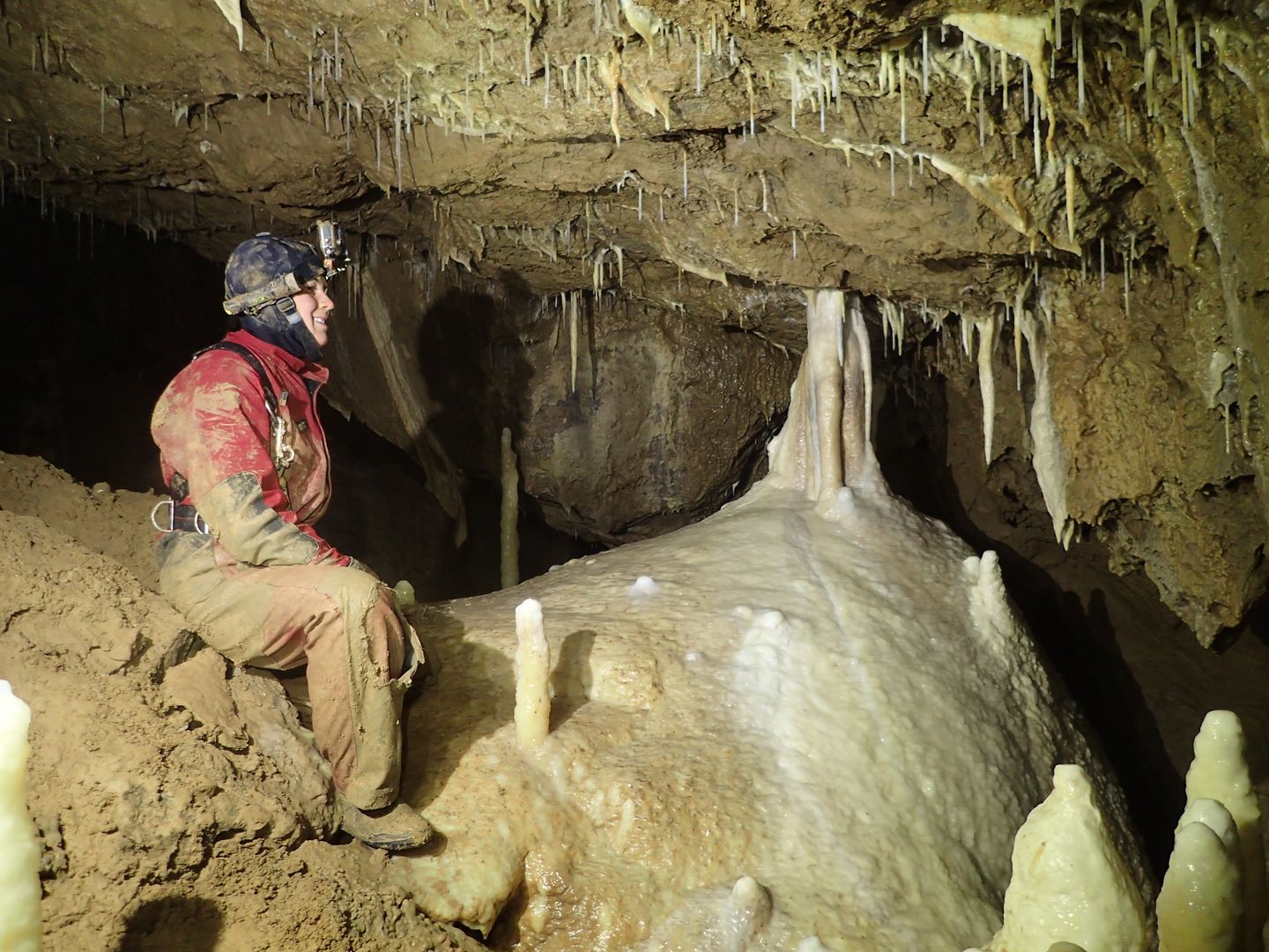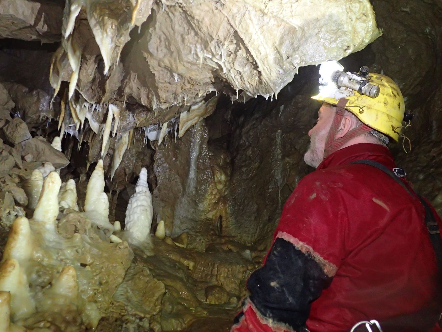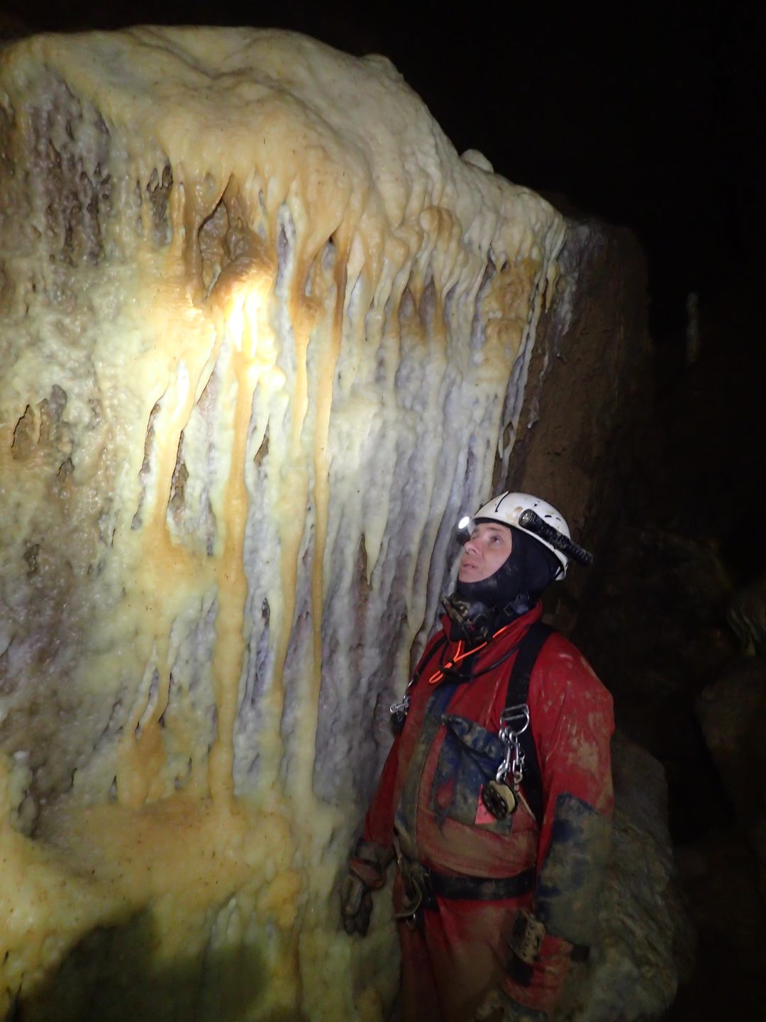 Begünstigt durch die angenehmere Wassertemperatur von zur Zeit 9°C konnten jetzt große Teile der Höhle vermessen werden. Der Höhlenbach folgt bis ca. 85m einem niedrigen Gang, unterbrochen von 6 Siphonen und zwei größeren Kammern bei 12m und 25m. Ab 85m führen Abzweige aus dem Wasser in Trockenbereiche. Schon im niedrigen Bachgang sind einige schöne Sinterformationen, teils als Excentriques, zu finden. In den Trockenbereichen ist die Sinterbildung deutlich stärker ausgeprägt.