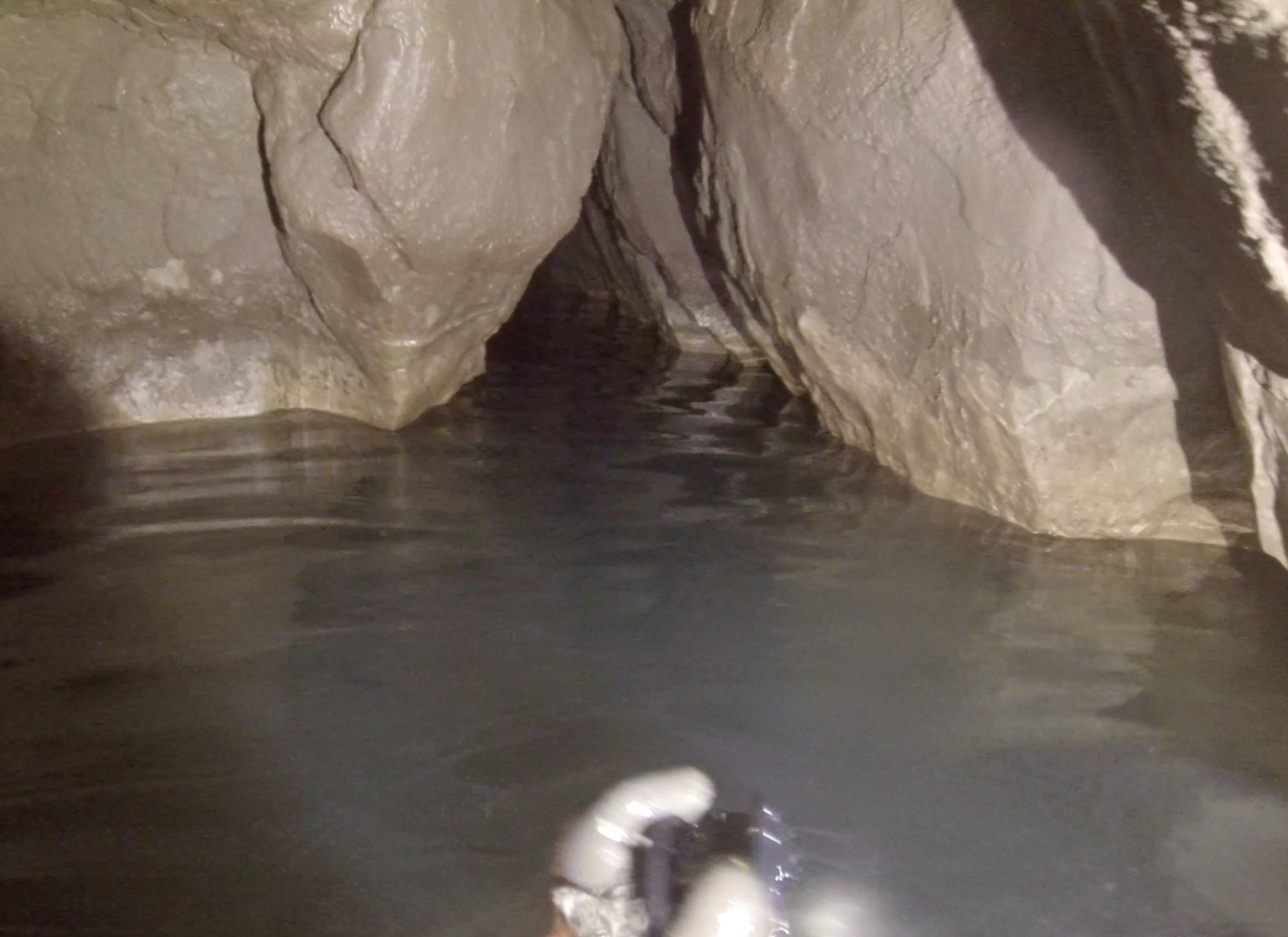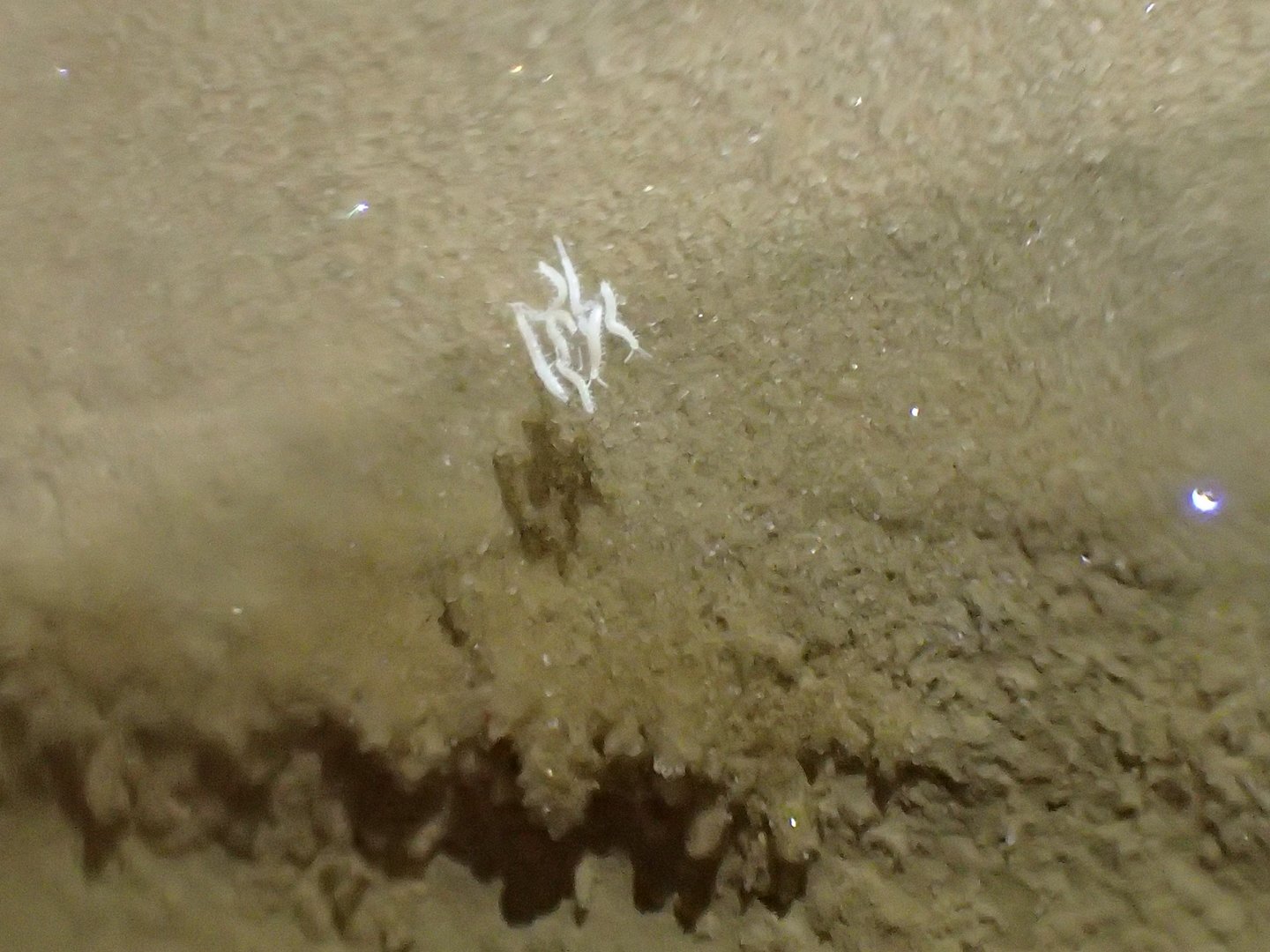 Der Bachgang endet zur Zeit in einer Pool-Halle bei 160m Hauptgang-Länge. In diesen Pool fließt frisches Wasser nach, aber bisher konnte keine passierbare Fortsetzung gefunden werden. Durch die recht große Wassertiefe von über 3m ist hier die Strömungsgeschwindigkeit sehr gering. Aufgewirbelter Lehm verteilt sich schnell und trübt die Sicht komplett ein. Durch Tasten konnte ein weiterführender Gang gefunden werden, der erstaunlicherweise steil nach unten führt, auf eine aktuelle Maximaltiefe von 8,9m. Die Gangrichtung konnte leider nicht ertastet werden 🙂