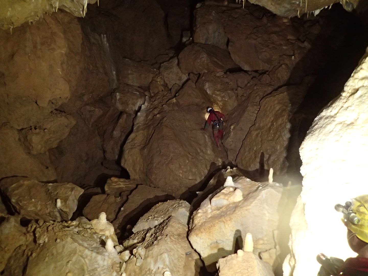 Von der Dachkammer führt ein breiter Gang steil nach unten, in eine große Halle, ca. 20x25m mit einer geschätzten Deckenhöhe von 15-20m. Der Hallenboden besteht aus großen bis riesigen Versturzblöcken und liegt ca. 14m über dem Wasserspiegel. In weiten Bereichen ist ein Kellerbereich unterlagert, der durch Spalten zwischen den Blöcken erreicht werden kann, bis zu 7m tiefer liegt und neben Kriechgängen auch größere Räume bietet.