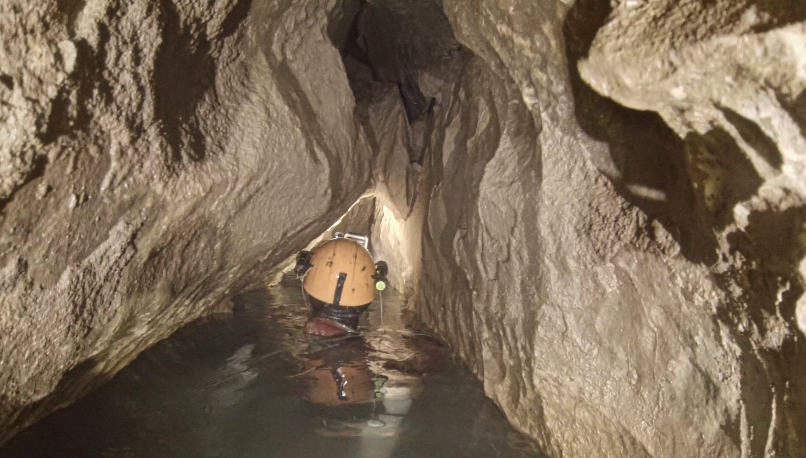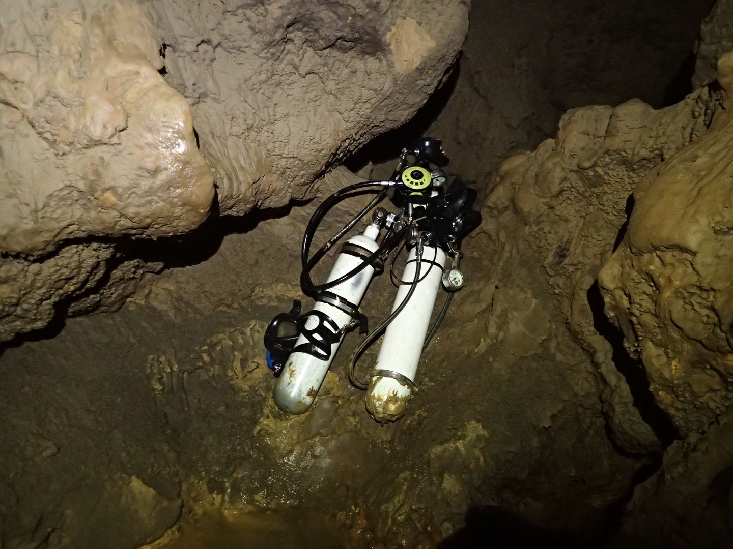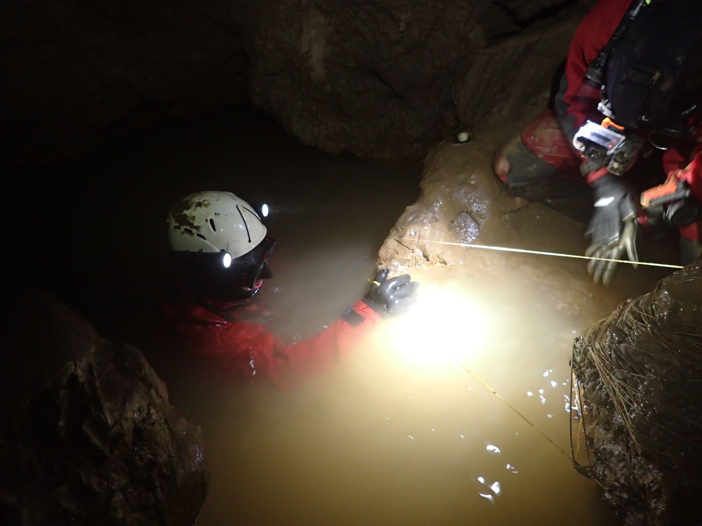 Dazu wurden seit dem 03.12.2016 bisher insgesamt 9 Befahrungen durchgeführt. Nach einer Winterpause – bedingt durch Wassertemperaturen von 6°C, leichtes Hochwasser und sehr trübes Wasser mit Sichtweiten von ca. 20cm – wird seit April wieder aktiv an der Erkundung gearbeitet. Dabei konnte der unterirdische Bachlauf auf eine Strecke von 160m in den Berg verfolgt werden. Bis dahin müssen 13 teilweise extrem enge Siphone durchtaucht werden. Auf dem Weg in die Höhle ist es nicht einfach mit der ganzen Ausrüstung durch diese Engstellen zu tauchen. Auf dem Rückweg wird es deutlich schwieriger, da selbst der führende Taucher durch aufgewirbelten Lehm kaum noch etwas sehen kann.