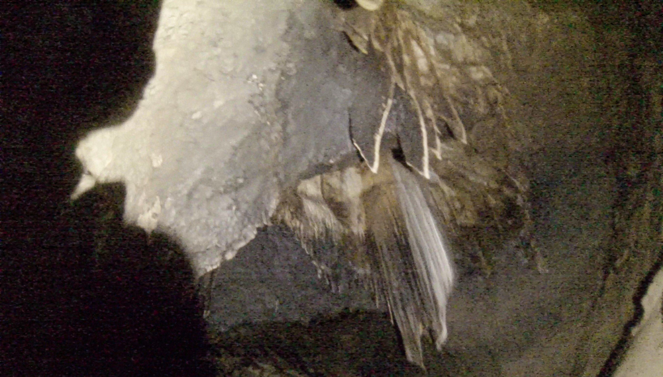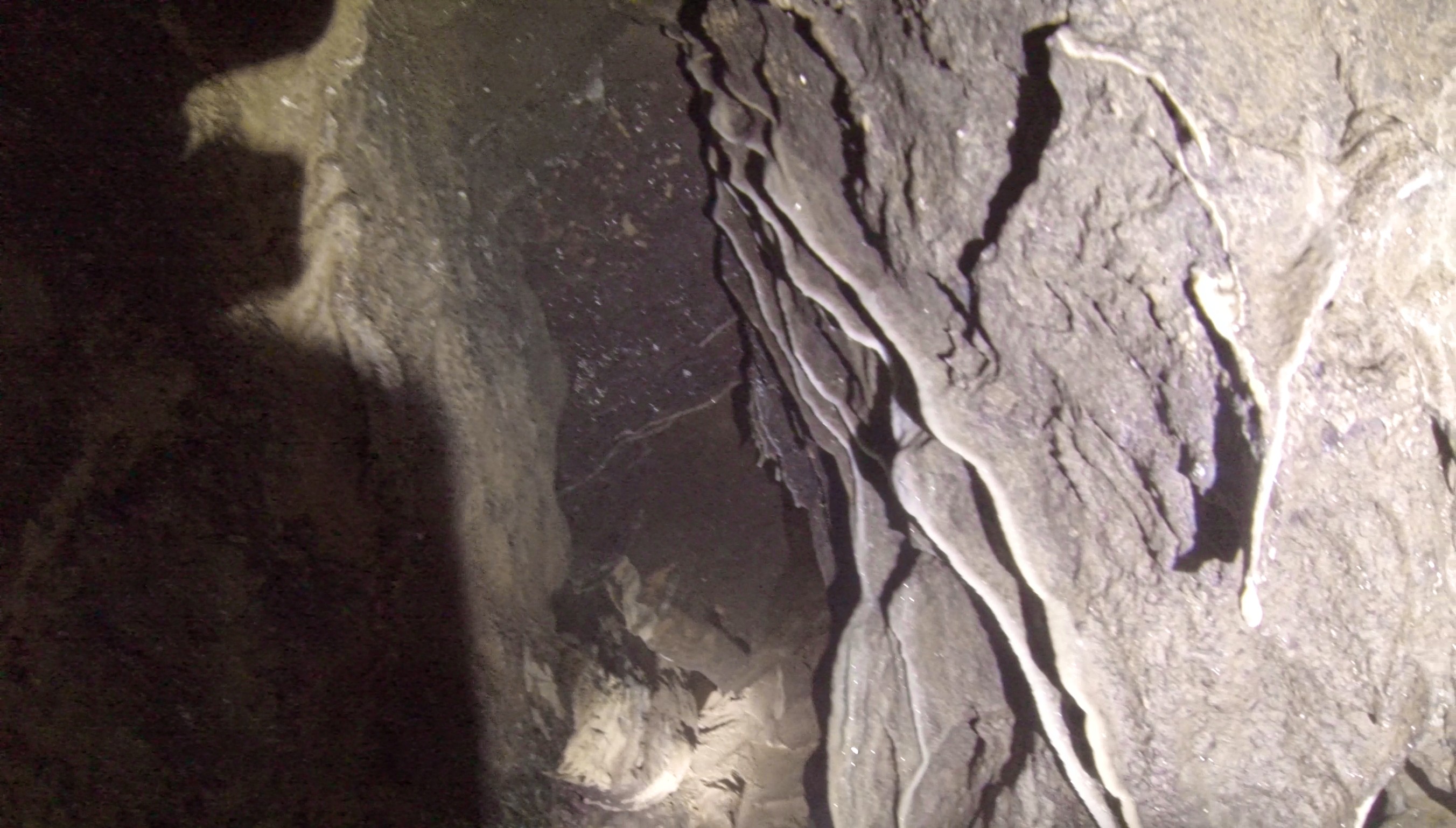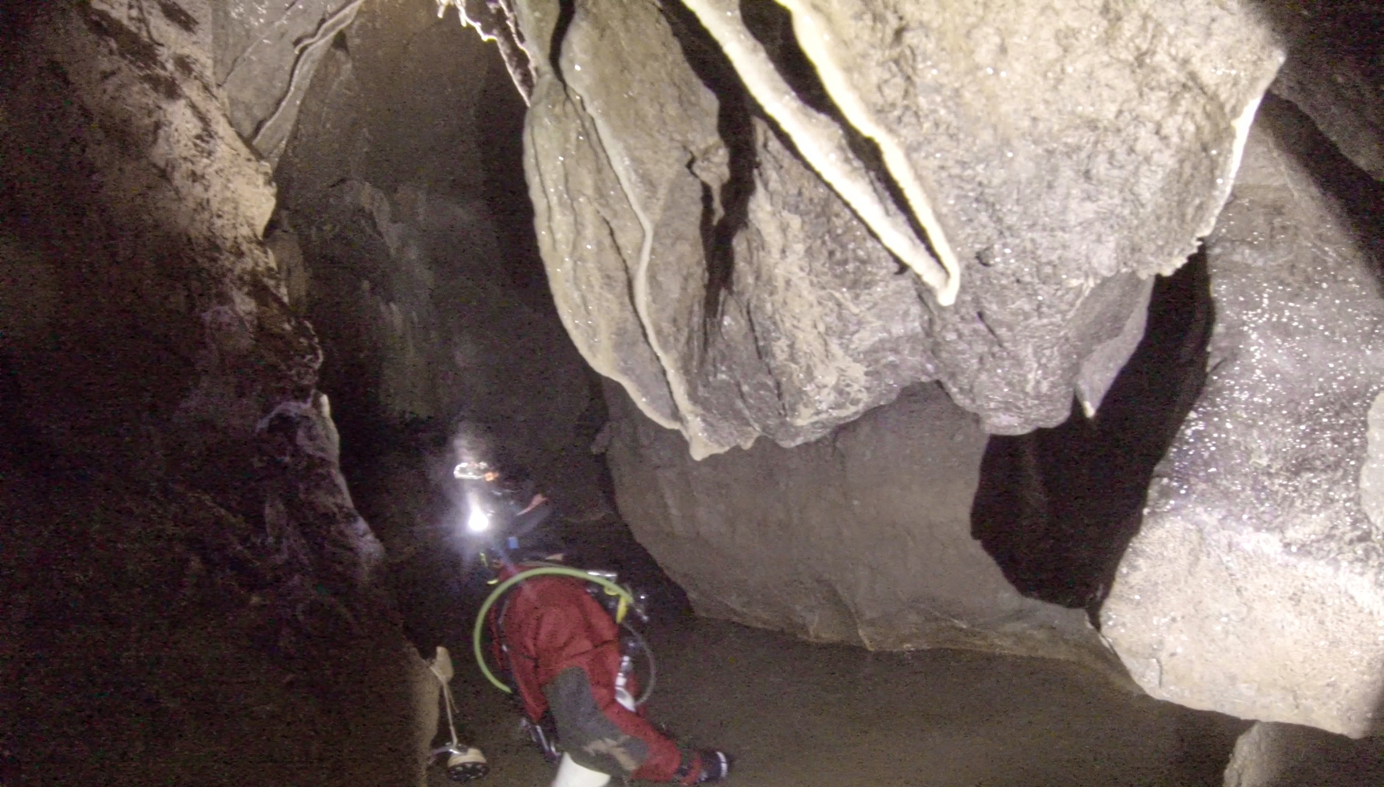 Die Sinterhalle endet im Norden in einer sehr engen, unpassierbar erscheinenden Spalte unter Wasser. Trotz der durchtretenden Strömung ist die Sicht innerhalb von Sekunden nahe Null. Nach kurzem Suchen finden wir aber weiter vorne eine abzweigende Spalte die aus dem Wasser herausführt. Sie ist mit Tauchausrüstung nicht passierbar, aber nach Ablegen der Ausrüstung passt einer der Taucher durch das enge Loch. Direkt dahinter folgt der nächste große Raum. Notfalls können wir uns und unsere Tauchausrüstung hier durchschieben um weiter zu kommen.