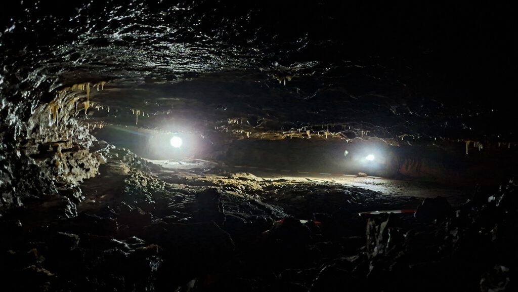 An einer Kreuzung ging es in zwei Richtungen geräumig weiter. Wir wählten die linke. Zuerst bis drei Meter hoch ging es schließlich auf Knien weiter.