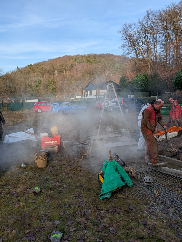 Nach dem Ausräumen des eingerutschten Materials haben wir die Höhle ALLE trotz offener mannshoher stark bewetterter Fortsetzung verlassen um uns neu zu organisieren.